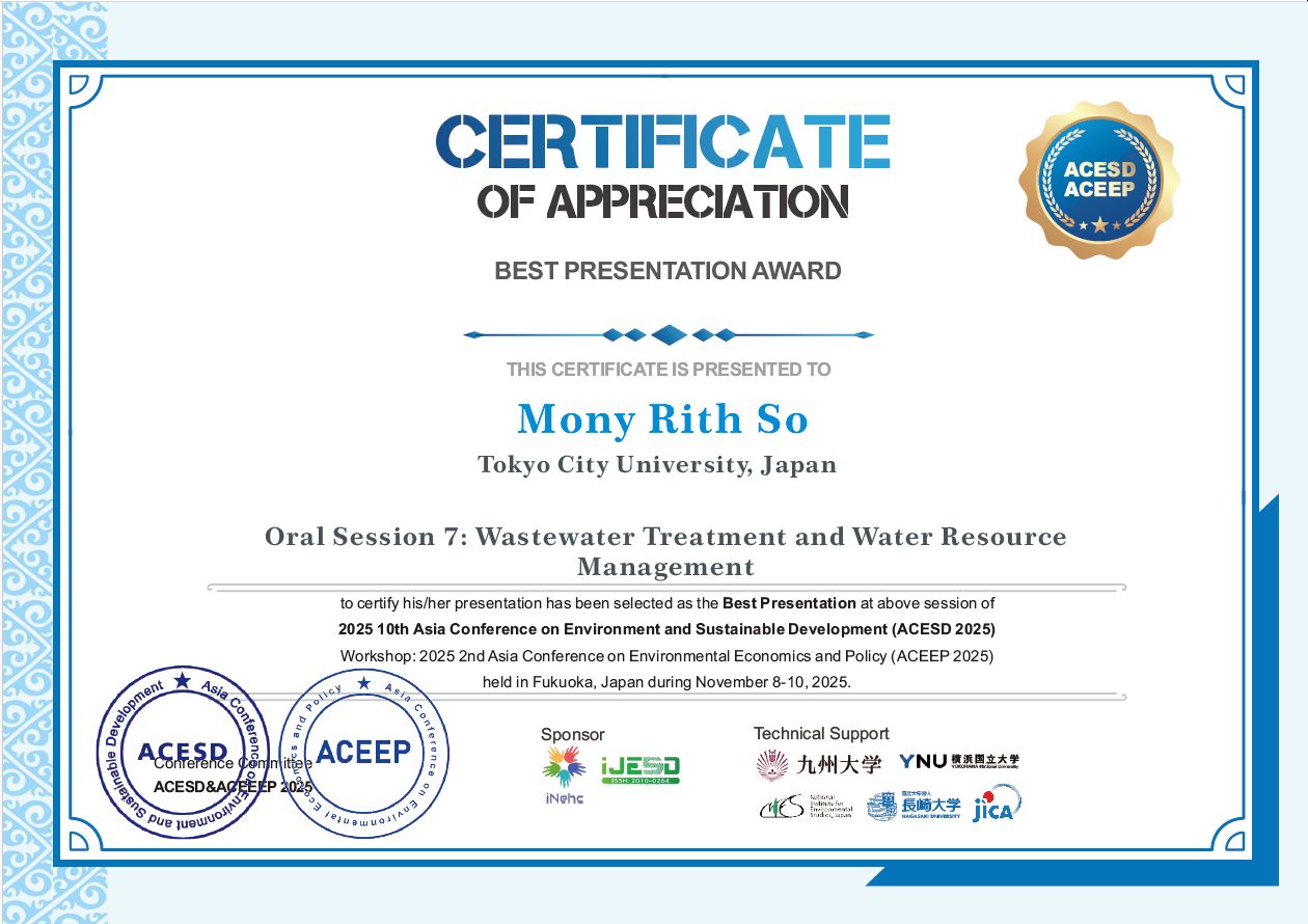 2025年11月8日から10日に福岡で開催された国際会議ACESD2025(2025 10th Asia Conference Environment and Sustainable development)において、環境創生学科横田研究室(都市生態計画)の大学院博士後期課程4年のソー モニ リットさんが、Best Presentation Awardを受賞しました。